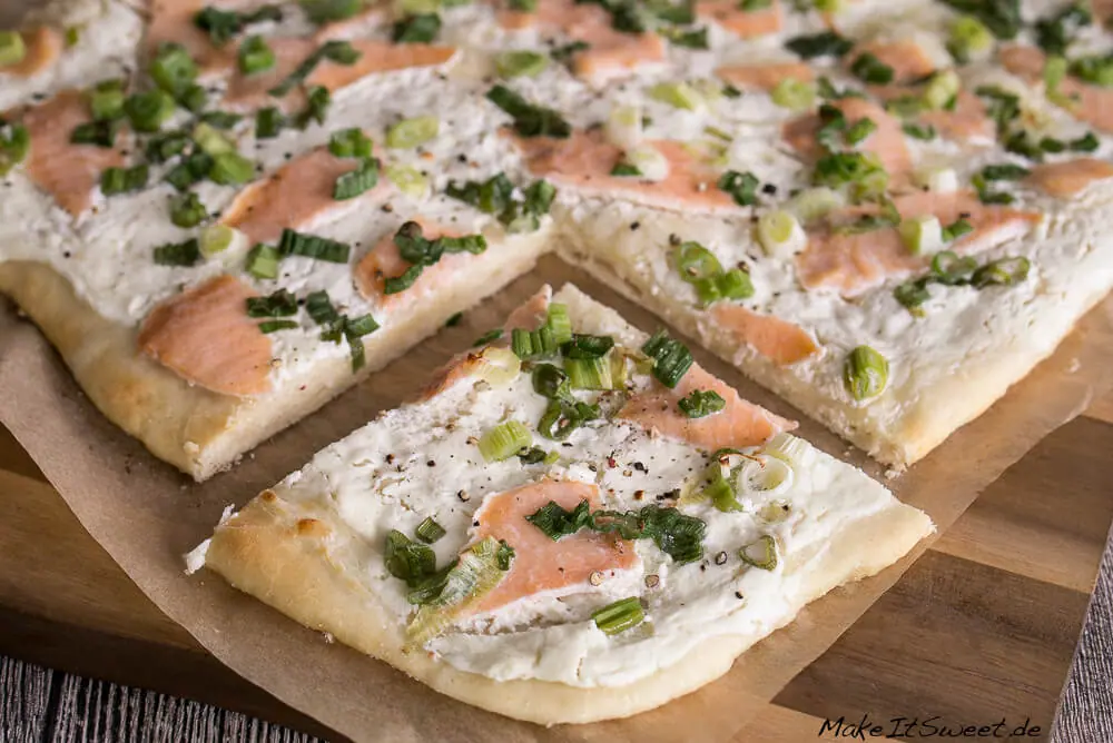 Ein einfaches Rezept für Flammkuchen mit Räucherlachs, Frühlingszwiebeln und Schmand. Der Teig wird mit Buttermilch, Olivenöl und ohne Eier zubereitet. Ich esse sehr gerne Räucherlachs und auf dem Flammkuchen ist es eine gute Alternative zum klassischen Flammkuchen mit Speck. Man kann den Flammkuchen auch sehr gut zur Hälfte mit Räucherlachs und zur Hälfte mit Speck belegen, falls man zu zweit ist und eine Person keinen Fisch mag. Wer möchte, kann noch etwas Dill über den Flammkuchen mit Lachs geben.