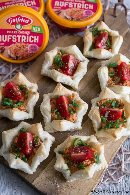 Heute habe ich ein schnelles Rezept für Fingerfood mit dem neuen Pulled Chicken Aufstrich von Gutfried, Lauchzwiebeln, Tomaten und Blätterteig für euch. Perfekt für die nächste Party, einen Brunch oder als Beilage beispielsweise zum Grillen. Im Rezept gibt es eine bebilderte Anleitung für die Blätterteig-Körbchen und durch den würzigen Aufstrich benötigt man nur wenige Zutaten für das Fingerfood.