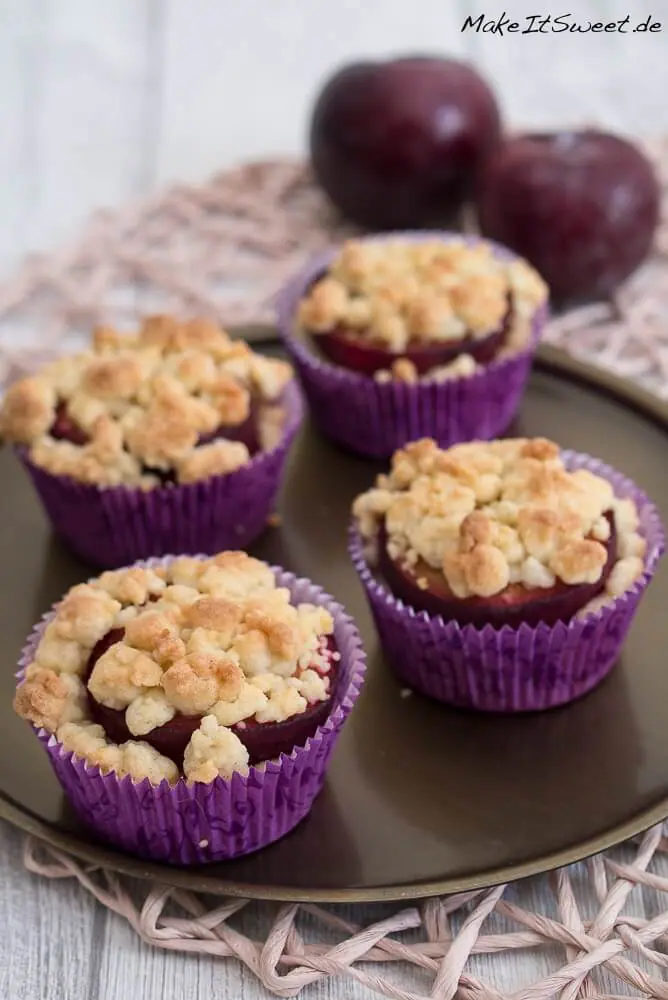 Fruchtige Pflaumen Muffins mit Zimt, gefüllt mit saftigen Pflaumen und bedeckt mit knusprigen Streuseln. Ein köstlicher Genuss, ideal zum Kaffee.