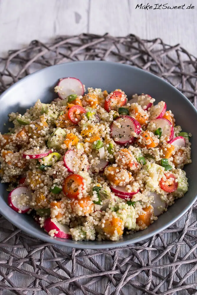 Ein bunter Quinoa-Salat mit gerösteten Süßkartoffeln, Avocado, Radieschen und einer Prise Zimt, verfeinert mit Chili und Pistazien. Perfekt gewürzt mit einem Dressing aus Olivenöl, Essig und Zimt.