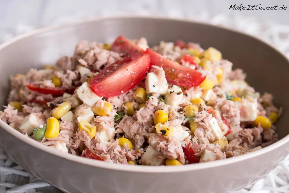 Ein schneller und leckerer Thunfischsalat mit Mais, Feta, Tomaten und Frühlingszwiebeln – perfekt zum Vorbereiten und Mitnehmen! Der Thunfisch wird mit einer Gabel zerkleinert und mit den anderen frischen Zutaten wie Mais, Feta und Tomaten vermengt. Ein einfaches Dressing aus Sonnenblumenöl, Essig und Senf rundet den Salat ab und sorgt für eine angenehme Frische.