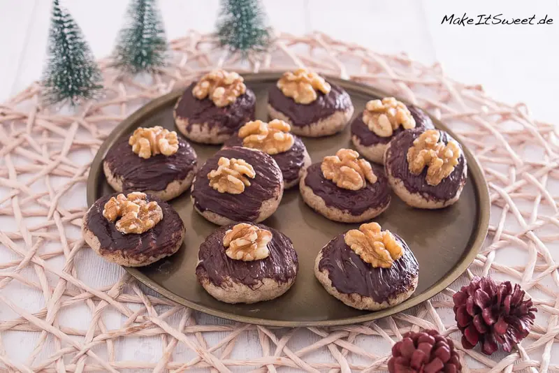 Ein Rezept für weiche Walnuss-Zimt-Plätzchen mit einem Schoko-Überzug und einer halben Walnuss oben drauf. Die Plätzchen sind einfach in der Zubereitung und es werden keine Ausstecher benötigt. Der Teig wird vorbereitet und muss dann etwas kühlen. Anschließend werden Kugeln geformt und diese auf dem Backblech mit einer Gabel flachgedrückt. Nach dem Backen und Abkühlen werden die Plätzchen mit Kuvertüre überzogen und einer halben Walnuss dekoriert.