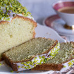 Nach dem Backen den Kuchen abkühlen lassen. Währenddessen kann man den Guss vorbereiten. Hierfür 125 g Puderzucker mit den 3 EL Limettensaft in einer kleinen Schüssel zu einer glatten Masse verrühren. Den Guss mit einem Pinsel auf den Kuchen verteilen und direkt mit den 25 g gehackte Pistazien bestreuen.