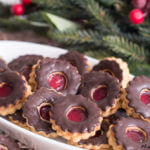 Blankenhagener Plätzchen mit einer fruchtigen Johannisbeergelee-Füllung, die zwischen zwei knusprigen Plätzchen eingeschlossen ist. Der Überzug aus Zartbitterschokolade rundet das Ganze ab und sorgt für einen süßen, schokoladigen Genuss.