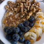 50 g Blaubeeren waschen. 1 Banane schälen und in Scheiben schneiden. 15 g Walnüsse grob zerkleinern. Die Blaubeeren, Bananenscheiben, Walnüsse, 3 EL Honig und etwas Zimt auf den Haferbrei geben und alle gut verrühren.