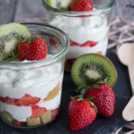 Die Hälfte der Kiwis und Erdbeeren auf die beiden Gläser aufteilen. Die Hälfte des Quarks darüber verteilen. Anschließend die restlichen Kiwi- und Erdbeerstücke auf den Quark geben und mit einer Quarkschicht abschließen. Mit den Kiwischeiben und den ganzen Erdbeeren dekorieren.