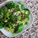 Für das Dressing 6 EL Essig, 4 EL Olivenöl, 2 EL Limettensaft, 2 TL Honig und 2 TL Senf verrühren. Mit Salz und Pfeffer würzen und über den Salat geben.