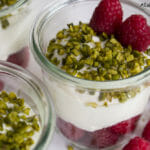 Pro Portion zwei schöne Himbeeren zur Dekoration beiseitelegen. Die restlichen Himbeeren auf die Gläser verteilen. Die Quark-Sahne-Creme in die Gläser füllen. Hierfür verwende ich gerne einen Spritzbeutel, dann bleiben die Gläser am Rand sauber. Die 20 g Pistazien auf der Creme verteilen und mit jeweils zwei Himbeeren dekorieren. Für ungefähr eine Stunde zugedeckt im Kühlschrank kalt stellen, damit die Creme fest wird.