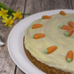 Ein saftiger Karottenkuchen mit knackigen Walnüssen und einer süß-säuerlichen Buttercreme. Perfekt abgerundet mit Marzipankarotten und Walnüssen als Dekoration.