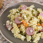 In einer Schüssel 6 EL Olivenöl, 6 EL Essig, Salz und Pfeffer zu einem Dressing verrühren. Die Zwiebeln, Kabanossi sowie Erbsen und Möhren hinzugeben. 125 g Feta abschütten und über die anderen Zutaten zerbröseln (alternativ in kleine Würfel schneiden). Alles verrühren. Zum Schluss die Nudeln hinzufügen und unterheben.
