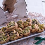 100 g Zartbitter-Kuvertüre über einem Wasserbad erhitzen und in einen Spritzbeutel füllen. Auf den Plätzchen verteilen und direkt mit 25 g gehackte Pistazien bestreuen. Anschließend die Kuvertüre fest werden lassen.