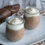 Zwischenzeitlich die 150 g Schlagsahne zu einer festen Sahne aufschlagen. Pro Portion zwei Esslöffel der Sahne in einen Spritzbeutel oder alternativ eine geeignete Tüte füllen und beiseite stellen. Wenn die Schokolade mit der Butter geschmolzen sind, diese unter die Schlagsahne heben. Danach die 30 g gemahlene Haselnüsse hinzugeben und ebenfalls unterheben.