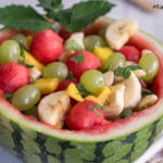 4 EL Zitronensaft über das Obst geben und alles gut verrühren. Die Wassermelonenhälfte mit dem Obstsalat auffüllen und den restlichen Obstsalat kalt stellen.